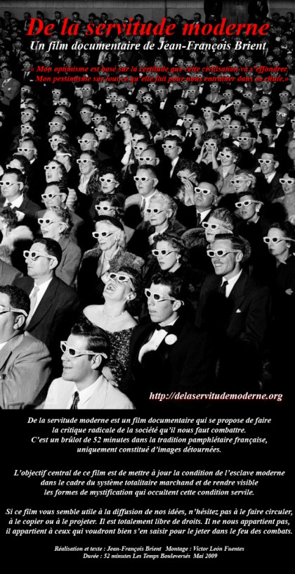 A servidão moderna é um livro e um documentário de 52 minutos (você perde esse tempo fazendo tanta merda) produzidos de maneira completamente independente; o livro (e o DVD contido) é distribuído gratuitamente em certos lugares alternativos na França e na América latina. O texto foi escrito na Jamaica em outubro de 2007 e o documentário foi finalizado na Colômbia em maio de 2009. Ele existe nas versões francesa, inglesa e espanhola. O filme foi elaborado a partir de imagens desviadas, essencialmente oriundas de filmes de ficção e de documentários.